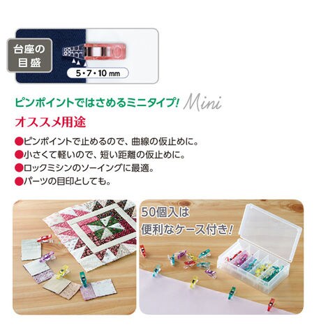 仮止めクリップ ミニ 50個入(赤・紫・青・黄・緑、各10個) 便利なケース付 クロバー 裁縫仮止めクリップ 手芸仮止めクリップ clover 仮止めクリップスペック
