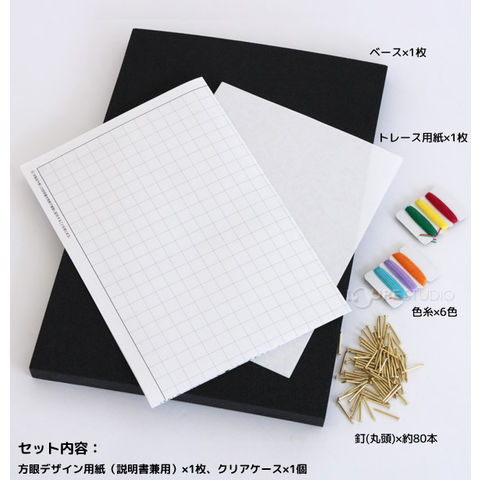 | セット内容 | ベース…1枚、色糸…6色、釘(丸頭)…約80本、トレース用紙…1枚、方眼デザイン用紙(説明書兼用)…1枚、クリアケース…1個 |