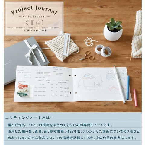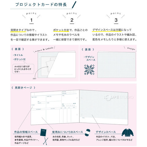 使用した編み針、道具、糸、参考書籍、作品寸法、アレンジした箇所についてのメモなど忘れてしまいがちな作品についての情報を記録できる、使いやすいカードタイプのニッティングノートです。抜き差しが自由なので、書きためた後でも、 並べ直しやアイテム別の分類など、使いやすく整理できます。プロジェクトカードにはポケットが付いており、毛糸のラベルや編み図を一緒に保管できて便利です!リボンは取り替えできるのでお好みにアレンジできます。