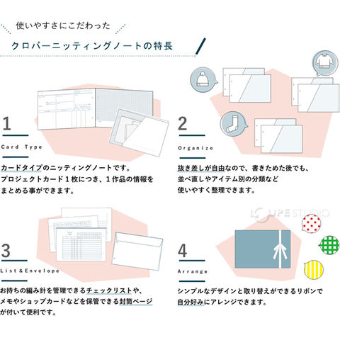 編んだ作品の情報を記録するための専用ノート。カードタイプになっていて、カード1枚につき1作品の情報をまとめることができます。抜き差しが自由で、書き溜めた後でも整理ができて便利です。