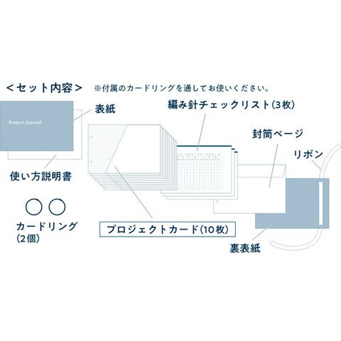 | セット内容 | ・表紙 ・説明書 ・プロジェクトカードX10枚 ・あみ針チェックリストX3枚 ・封筒ページX1枚 ・裏表紙 ・カードリングX2個 |