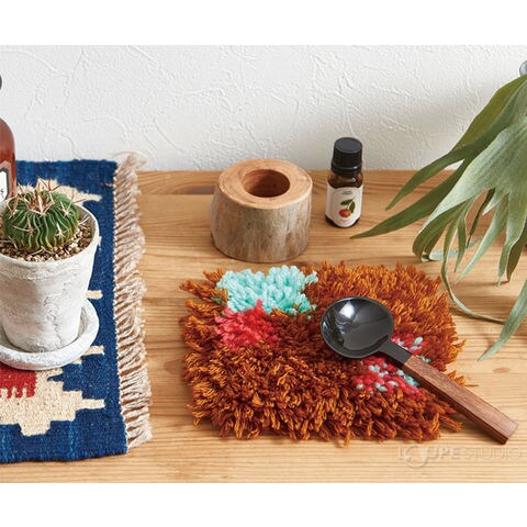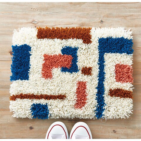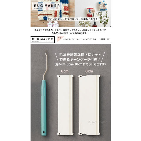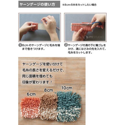 毛糸や好きな糸をカットして、専用フックでメッシュに結びつけていくだけで自分だけのオリジナルラグが作れます。毛糸を均等な長さにカットできるヤーンゲージ付き。約6cm・8cm・10cmにカットできます。ヤーンゲージを使い分けて毛糸の長さを変えるだけで、同じ面積を埋めても印象が変わります。4つの作品(コースター、クッションカバー、ラグ、タペストリー)の説明書付きなので、初めての人でも作品作りが楽しめます。