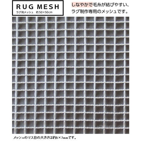 しなやかで毛糸が結びやすい、ラグ制作専用のメッシュです。メッシュのマス目の大きさは約5×7mmです。毛糸をカットして、専用フックでメッシュに結びつけていくだけで自分だけのオリジナルラグがつくれます。
