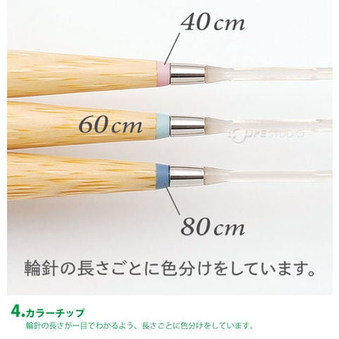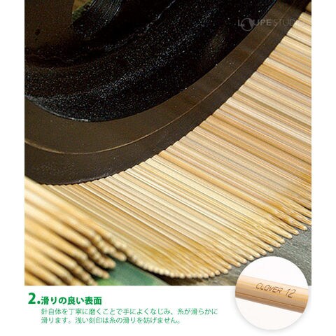 「編みやすい針先」 、「滑りの良い表面」、「段差がないスムーズな接合部」、「輪針の長さが一目でわかるカラーチップ」、「コードがねじれず快適な回転するコード」、「ソフトなコード」、編みやすさにこだわり、全てがアップグレードしました。国内の寒冷地で育つ良質な竹を厳選し、クロバーの長年培った技術をもって自社の工場で一本一本、品質にこだわり作っています。針先まで丹念に仕上げられた編み針は、編み心地が良く、編むほどに手になじみ、長く愛用していただける逸品です。