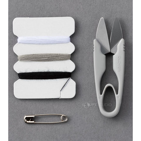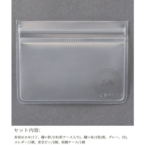 セット内容糸切はさみ/1丁、縫い針/2本(針ケース入り)、縫い糸/3色(黒、グレー、白)、スレダー/1個、安全ピン/2個、収納ケース/1個