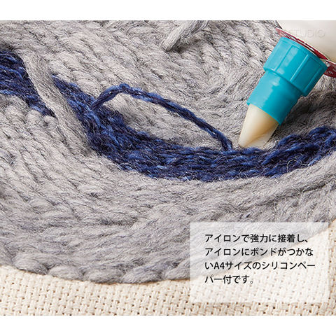 | ご注意 | ご使用前に必ず目立たない部分で試し、好ましくない場合は使用しないでください。 薄い生地や薄い色の生地は、ボンドの量が多いとしみ出しますのでご注意ください。 黒などの濃色の生地に多量に使用して接着剤がしみ出した場合、乾くと白く見えることがありますのでご注意ください。 高温に弱い化学繊維類は、シリコンペーパーの上からあて布をしてアイロンをかけてください。 水洗い、ドライクリーニング(石油系)ができます。 |