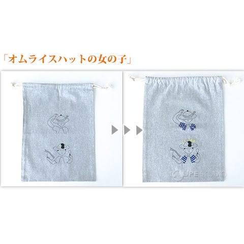 イラストがプリント済みの巾着(縫製済み)に刺しゅうのアレンジができるキットです。