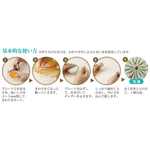作り方は、プレートに布を挟んで、はさみで切り抜いたら→ぬいしろを押さえて、針と糸でちくちくちく…→プレートからはずし、キュッと絞ってできあがりです。