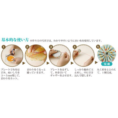 作り方は、プレートに布を挟んで、はさみで切り抜いたら→ぬいしろを押さえて、針と糸でちくちくちく…→プレートからはずし、キュッと絞ってできあがりです。