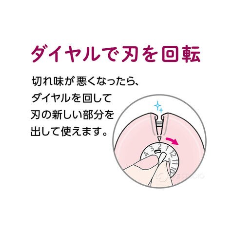 - 45mmロータリーカッター刃を内蔵。刃の切れ味が悪くなったら、ダイヤルを回して刃の新しい部分を出して使えます。(ダイヤル1周で12箇所使えます)