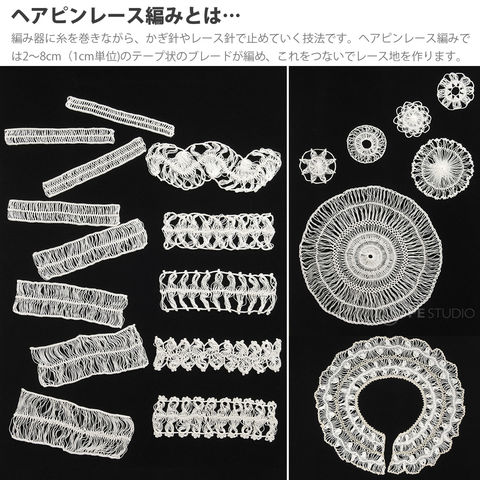 ヨーロッパで婦人の髪にさすピンを使い編まれたのが、はじまりと言われています。編み器を使い、ブレードと呼ばれるループ状の編み地を作ります。このブレードを編みつなげたり、縁を飾ることで様々な作品を作ることができます。