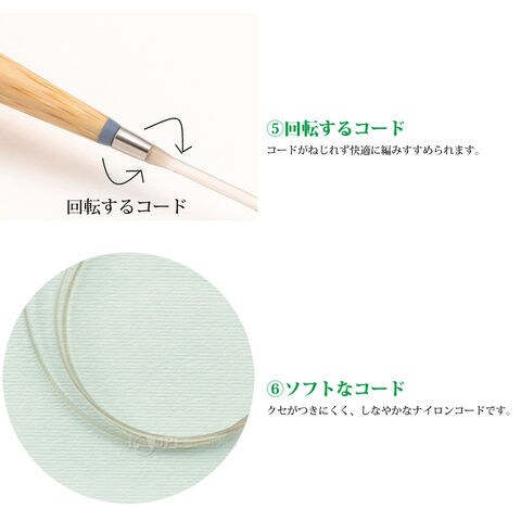 「編みやすい針先」 、「滑りの良い表面」、「段差がないスムーズな接合部」、「輪針の長さが一目でわかるカラーチップ」、「コードがねじれず快適な回転するコード」、「ソフトなコード」、編みやすさにこだわり、全てがアップグレードしました。