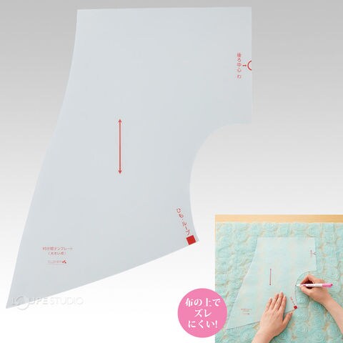 シリコーン製で重みのあるテンプレートなので、レース地などの布の上でも ズレにくく、安定したしるし付けができます。布柄が透けて見える テンプレートなので、好きな布の好きな部分で付け襟が作れます。