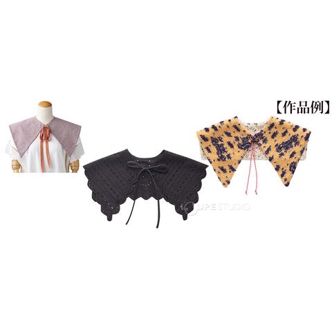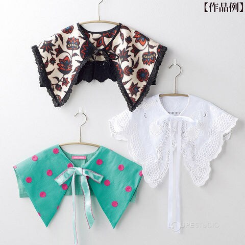 基本の付け襟は、襟部分を表布と裏布の2枚で作り、リボンなどのひもで結んで留めるタイプの付け襟です。フリルで縁を飾ったり、バイアステープで縁取ったり、フェイクファーなどで作ったり、着なくなったお洋服から作り変えもアレンジ自在、お好みの布で付け襟づくりができます。