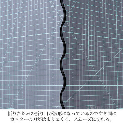 - 折りたたみの折り目が波形になっているのですき間にカッターの刃がはまりにくく、スムーズに切れる。