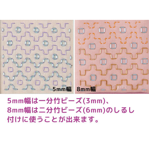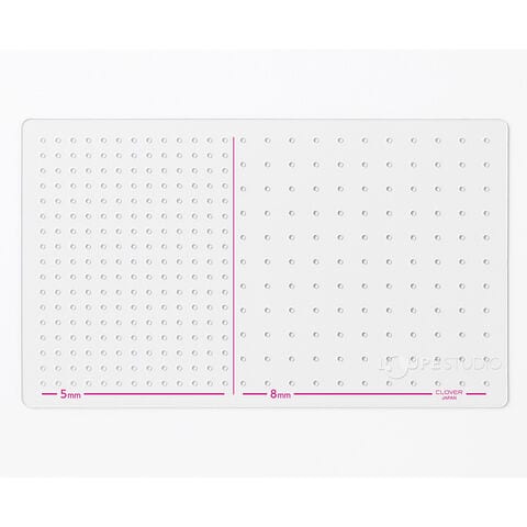 ビーズ刺し子のステッチの前に正確な印を付けるためのプレートです。5mm幅は一分竹ビーズ(3mm)、8mm幅は二分竹ビーズ(6mm)のしるし付けに使うことが出来ます。ドットが正確に付けられるので、作品もきれいに仕上がります。ブローチやポーチ、オーナメント作りはもちろん、洋服やバッグ、小物など既製品のアレンジも楽しめます。
