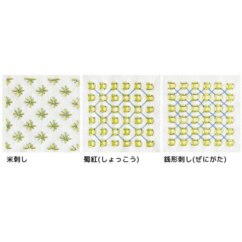 平山道(ひらやまみち)、矢羽根(やばね)、段つなぎ、柿の花、角十つなぎ(かくじゅう)、十の木(じゅうのき)、米刺し、蜀紅(しょっこう)、銭形刺し(ぜにがた)