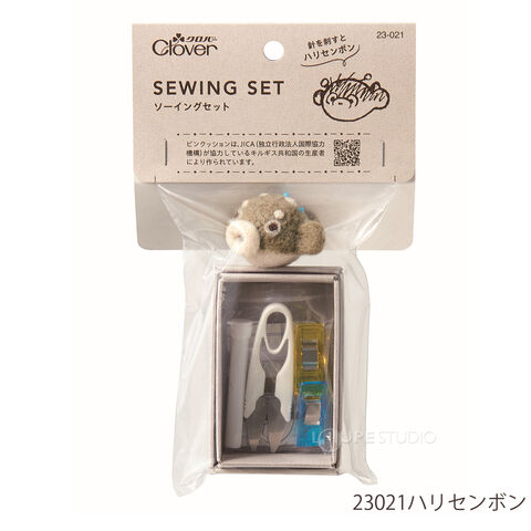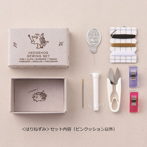 | セット内容 | ピンクッション/1個、糸切はさみ/1丁、縫い針(ケース入り)/2本、仮止めクリップ/2個、待針(ピンクッションに刺されています)3本、縫い糸/3色(黒・ベージュ・白)、スレダー/1枚、収納箱/1個 |