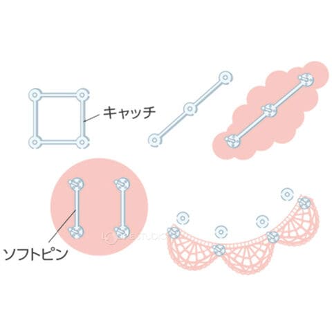 モチーフに縫い付けた「ソフトピン」を編み地などに差し込み、裏側から「キャッチ」で留めます。ピンとキャッチは、それぞれつながった状態のままでも、1個ずつバラして使用することもできます。