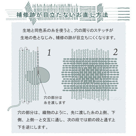 あいてしまった穴、シミ、生地のへたりの修繕を行います。