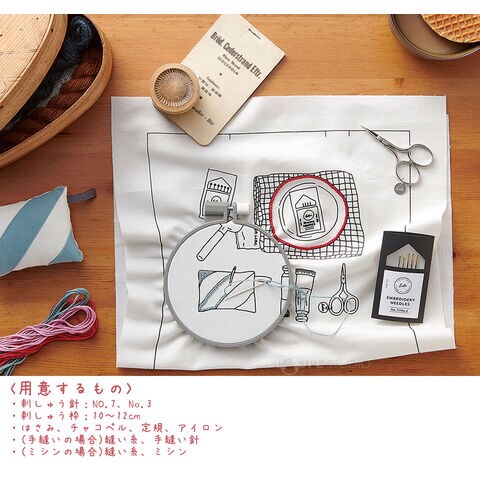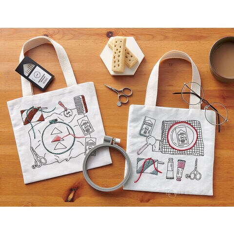 イラストがプリントされた生地にお好みで刺しゅうをして、バッグに仕立てるキットです。