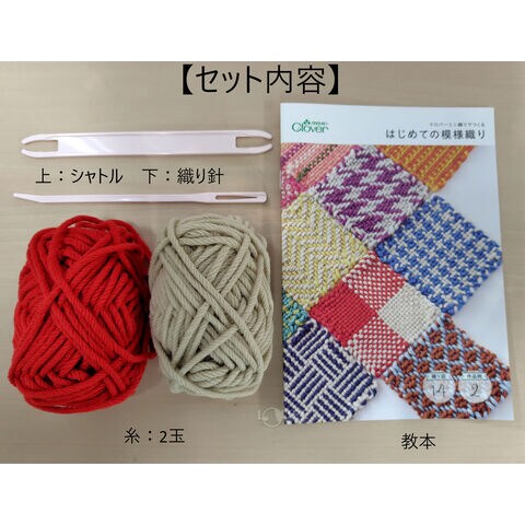 | セット内容 | シャトル/1本 織り針/1本 糸/2色各1玉(1玉あたり約25g) 小冊子(A5 24ページ)/1冊 |