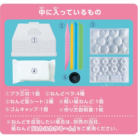 | 材質 | プラ芯材/PE 軽い紙ねんど/微小中空球樹脂、パルプ繊維粉、合成粘結剤、保存剤、防カビ剤、水 ねんどベラ/PS ゴムキャップ/エラストマー ねんど型シート/PE 作り方説明書/紙 |