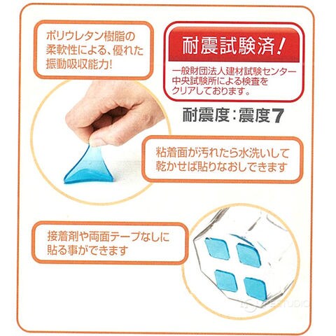 優れた振動吸収能力により、家具などの転倒を防ぎます。日本製でシックハウス基準に対応した安全素材を使用しています。