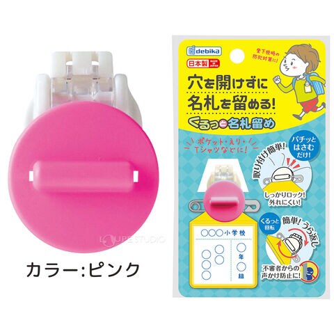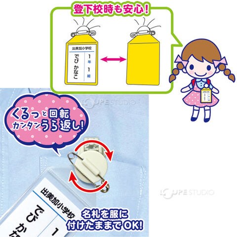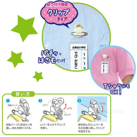 簡単に取りつけられるクリップタイプの名札留め。パチッとはさむだけ!TシャツにもOK!名札を服に付けたままで、くるっと回転!カンタンうら返し!登下校時も安心!
