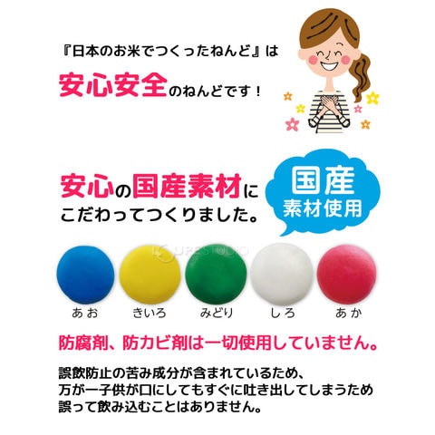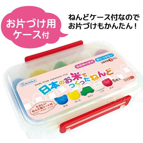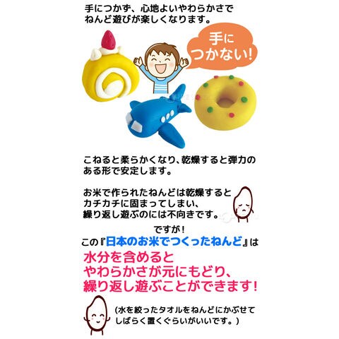 | 材質 | ねんど/米粉(国産米)、食品添加物(含水ケイ酸マグネシウム、硫酸カルシウム、セルロース、離型剤)、食用色素、塩分、水 ねんどケース/PP ねんど型/PE |