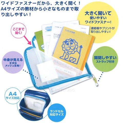 ワイドファスナーだから、大きく開く!A4サイズの教材から小さなものまで取り出しやすい!