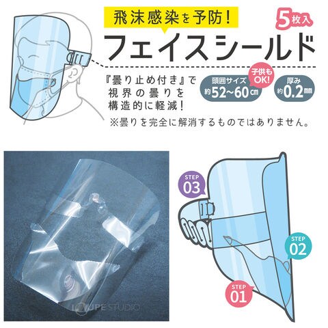 フェイスシールド 日本製 目立たない 5枚入 曇り止め付き フェイスガード マスク メガネの上から 透明 クリア ウイルス対策 感染予防 ウイルス ウィルス