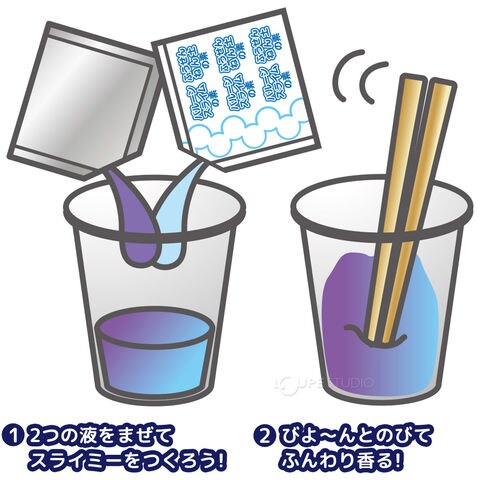 | 材質 | バルーンスライムの素/PVA水溶液、誤飲防止苦味剤、保湿剤 まほう水/ホウ砂水溶液、食用色素、マイカ顔料(パールピンクのみ)、香料、防腐剤 ストロー/PP |