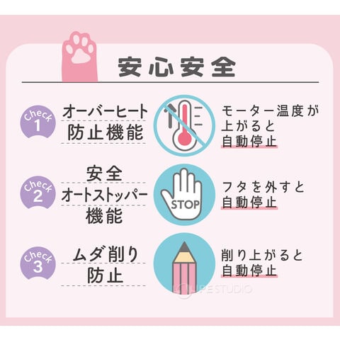 • 「ムダ削り防止」「安全オートストッパー」「オーバーヒート防止」機能付き