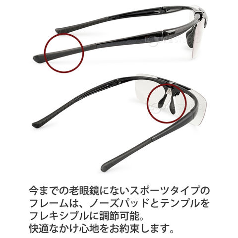 今までの老眼鏡にないスポーツタイプのフレームは、ノーズパッドとテンプルをフレキシブルに調節可能。快適なかけ心地をお約束します。