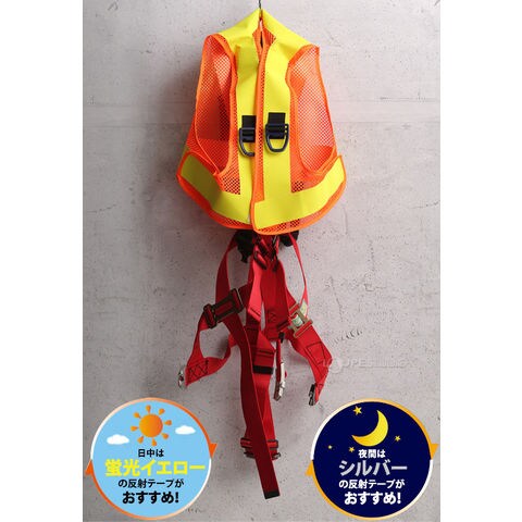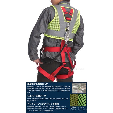 休止フック掛けによりベスト自体にフック掛けが可能です。安心のショート丈。腰道具の引っ掛かりがなく安全。女性や小柄の方でも着用可能なつくりとなっています。ベンチレーションメッシュを採用。メッシュ穴が大きく、通気性に優れています。反射材は氷点下でも割れにくい素材を使っています。しかも柔らかいので動きやすくなっています。高輝度反射でよく目立ちます。シルバー反射は国際規格EN/ISO20471適合の高視認性安全服に採用されている反射材を使用しています。※ベストのみの販売ページです。