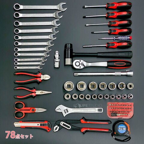| セット内容 | カッターナイフ コンベックス 3m ウォーターポンププライヤー 250mm コンビネーションレンチ(8/9/10/11/12/13/14/15/16/17/19mm) モンキーレンチ 200mm ラチェットハンドル 1/2 ソケットレンチ 1/2(8/9/10/11/12/13/14//15/16/17/18/19/22/23/ 24/27/30/32mm) ユニバーサルジョイント1/2 エクステンションバー 1/2x250mm コンビネーションハンマー ソケットドライバー ニッパー 150mm ラジオペンチ 150mm ハサミ 検電ドライバー グリップドライバー(-4x100/-6x100/NO.1x75/NO.2x100) ビットセット (H8/H6/H5.5/H5/H4/H3/H2.5/H2/H1.5・T40/T30/ 27/ T25/T20/T15/T10/T9/T8・PH0/PH1/PH2/PH3・PZ0/PZ1/PZ2/ PZ3・SL3/SL4/SL5/SL7・ソケットビット・ソケットアダプター ) 各1点(合計78点セット) |