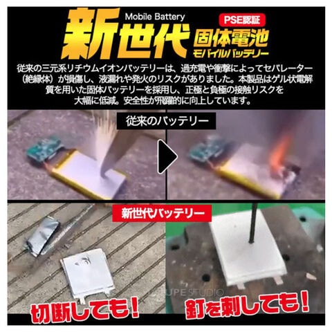 - 従来のリチウムイオンモバイルバッテリーは電解質が液体の為、落下等の外部からの衝撃、過充放電、使用環境等によってセパレーター(絶縁体)が損傷、正極・負極の電解質が液漏れ・接触してショートし、発火や爆発を起こすリスクがありました。本製品はゲル状電解質を用いた固体電池(半固体電池)を採用!正極・負極の接触・発火リスクを大幅に低減し、安全性を飛躍的に向上させたモバイルバッテリーです!