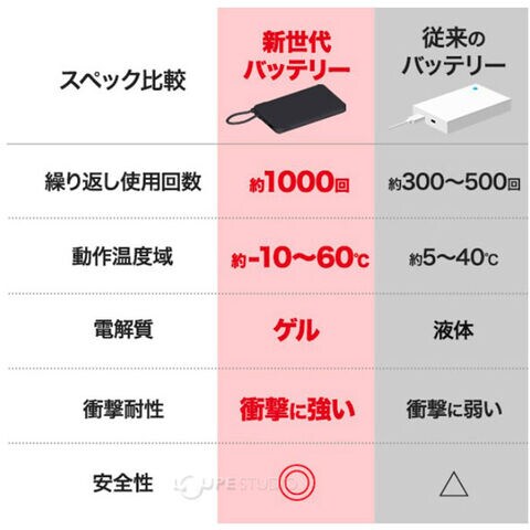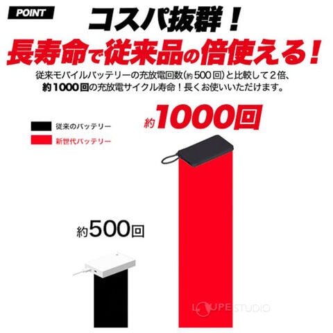 - 従来のモバイルバッテリー(約500回の充放電)に比べて、約2倍の1000回充放電サイクルに対応! 長く安心してお使いいただけます。