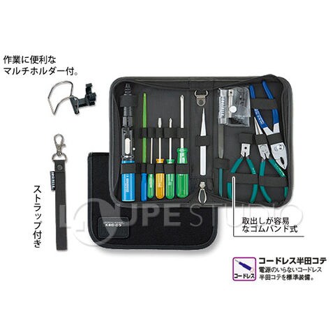| セット内容 | 強力ニッパー(NK-15)、コンビネーションプライヤー(PC-06)、ラジオペンチ(PR-16)、ピンセット(PTS-01)、調整ドライバー(DA-02)、+ドライバー(DS-03)、+ドライバー(DS-23)、-ドライバー(DS-33)、+ドライバー(DS-64)、六角レンチセット(TWH-01)、コードレス半田コテキャップ付(SK-60)、ホットブローリップ(SK-66)、糸ハンダ(SW-30)、ヤスリ平、マルチホルダー |