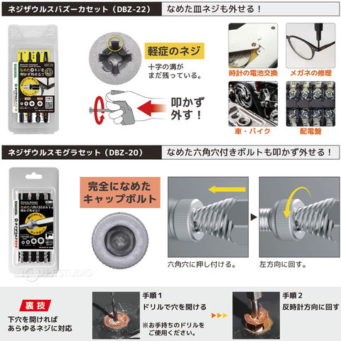 | セット内容 | DBZ-20/ネジザウルスモグラセット、DBZ-22/ネジザウルスバズーカセット、DR-19/ネジキャッチ(ライムグリーン 2個入)、DR-23/貫通エクステンション(150mm)、DR-25/ユニバーサルジョイント、DZ-70/ネジザウルスGTドライヴ、PZ-77/ネジザウルスGTV、ZC-28/ネジザウルスリキッド、KSE-35/ロールツールバック |