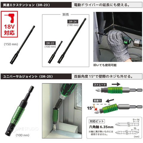 | 用途 | 潰れたプラスネジ、六角穴付きボルトの取り外しに。 狭く奥まった場所、コーナーや壁際での作業に。 工場や現場での修理、整備に。 その他、設備機器、自動車、バイク、自転車、農機具、船舶、スポーツ用品のメンテナンス、日曜大工にも。 |