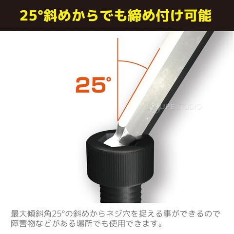 - ボールポイント形状で斜め25°の角度からでも締め付けできます。