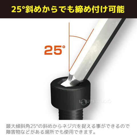 - ボールポイント形状で斜め25°の角度からでも締め付けできます。