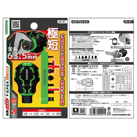 エンジニア STUBBYドライヴ&プラマイ極短 DZ-91 マイナスビット7本組 スタビーグリップ ドライバー 工具 スタビドライバー おすすめ 六角軸スペック