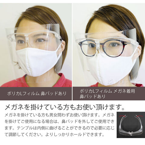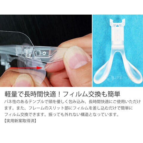 医療機関向けに作られたフェイスシールドをお手頃にお試しいただけるよう、フレームとフィルムをセットにした商品です。フレームカラーがクリアなので見た目の印象も軽く、違和感なく装着できます。