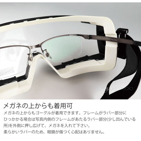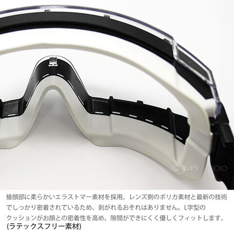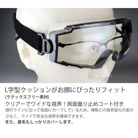 スタイリッシュなデザインの密閉型ゴーグルです。レンズは耐熱・耐衝撃のポリカーボネートを使用し、厚みは2mm。接顔部にはエラストマーを使用しており、衝撃から優しく守ります。メガネの上からも付けることができる保護ゴーグルです。眉毛もしっかりカバーします。