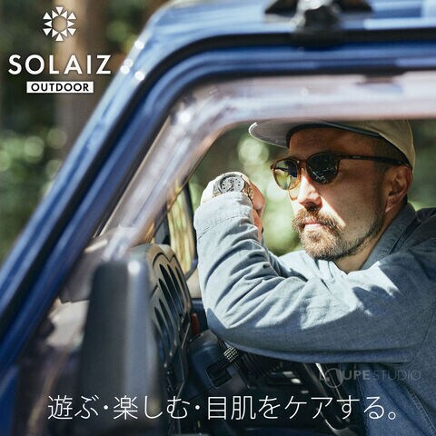 SOLAIZに偏光サングラス「SOLAIZ OUTDOOR」が登場!アイケア、スキンケアができるだけでなく、偏光機能をプラスしているので、水面のギラつきや、車のフロントガラスの映り込みなどの不快な反射光を抑えます。「偏光サングラス」と聞くとレンズの色が濃くて瞳が見えないものを想像しがちですが、SOLAIZの偏光サングラスは、可視光線透過率が一般使用に最適な30%と暗すぎず、快適な視界を確保。外遊びを思いっきり楽しみたい方にオススメのアイテムです。