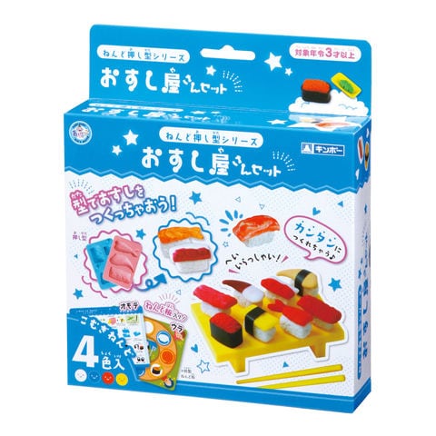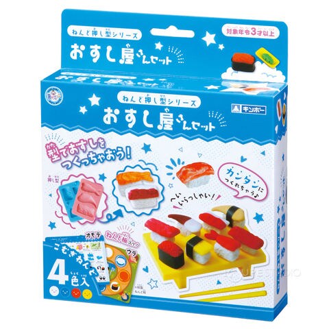 | 内容 | 小麦ねんど4色(白青赤黄/各30g)・保存袋・紙製ねんど板(両面)・押し型4個・ねんどローラー・すしげた・しょうゆ皿・おはし |