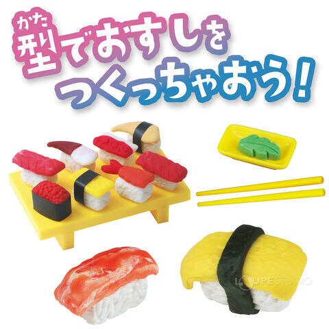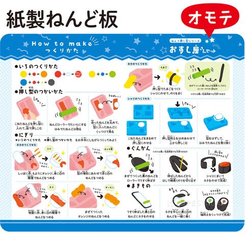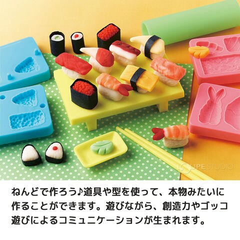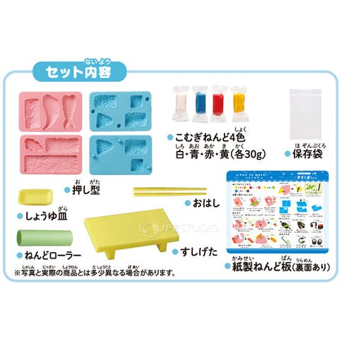 | 材質 | 小麦粘土/小麦粉・水・塩分・食用顔料・保存料、押し型/PP、しょうゆ皿・すしげた・おはし・ねんどローラー/ABS、保存袋/PE、ねんど板/紙 |